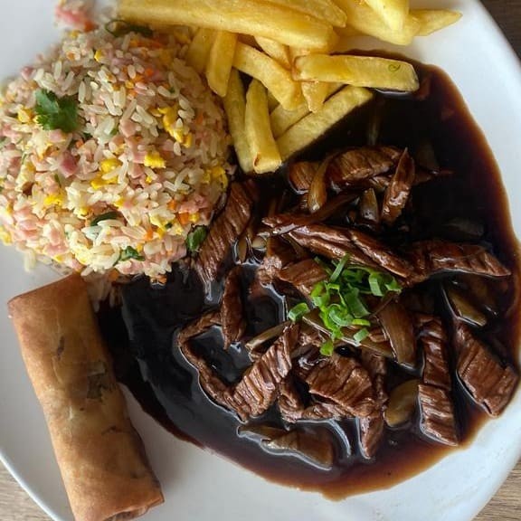 Carne levemente apimentado, frita com cebola, molho da casa, arroz chop suey e batata frita, com rolinho primmavera de acompanhamento (Porção Para Uma Pessoa