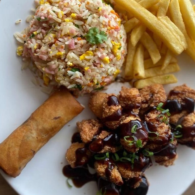 Frango levemente apimentado, empanado e frito, molho takasitu, arroz chop suey e batata frita, com rolinho primmavera de acompanhamento (Porção Para Uma Pessoa)