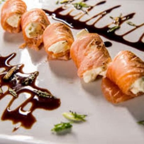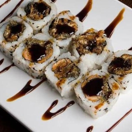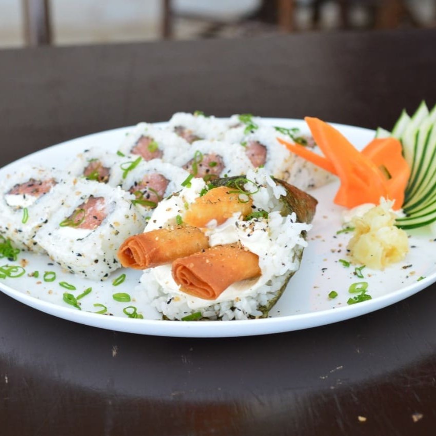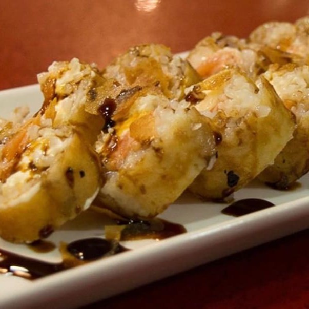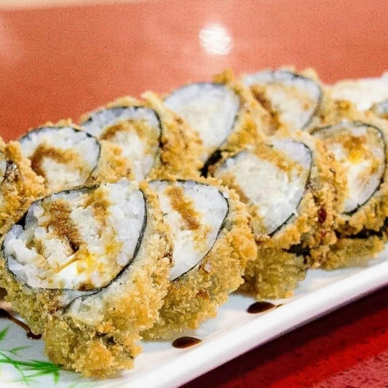 Envolvido em massa de rolinho primavera por fora, sem alga, com arroz, cream cheese, cebolinha, gergelim e teriyaki.