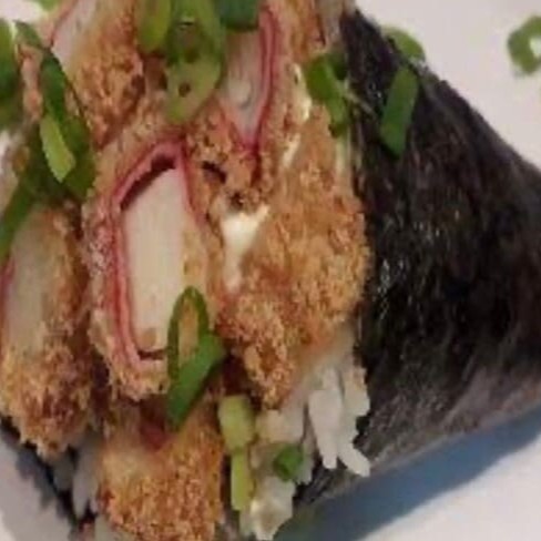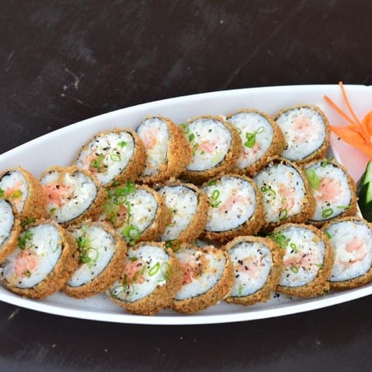 Enrolado de arroz, creme cheese alga em forma de cone com cebolinho e gergilin, com recheio empanado,