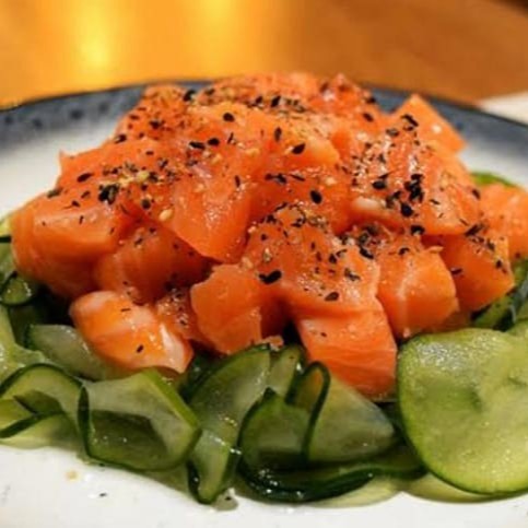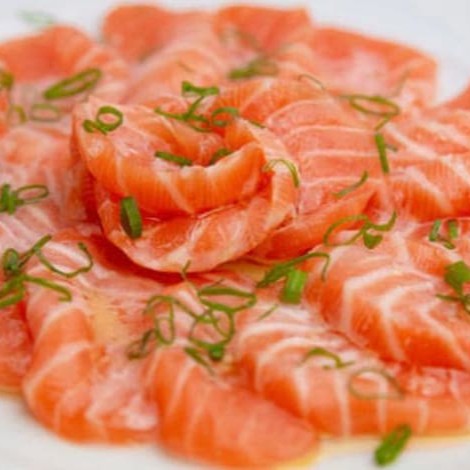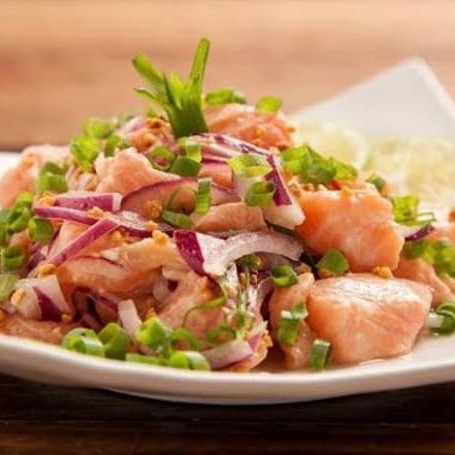 Salmão marinado em limão e azeite, com cebola roxa, pimenta biquinho, dedo de moça, tagarashi e cebolinha.
