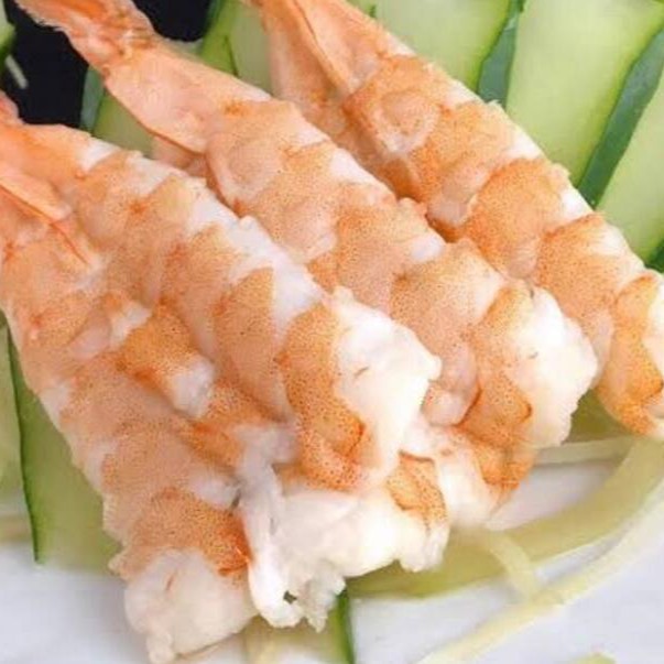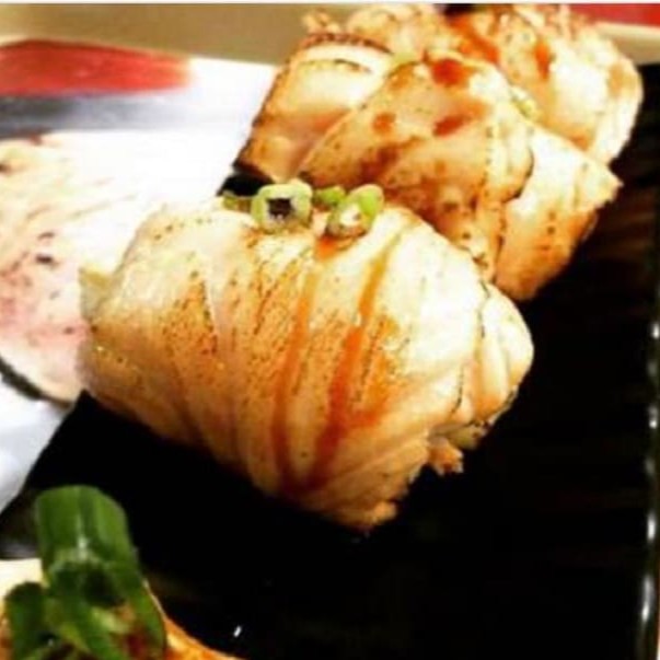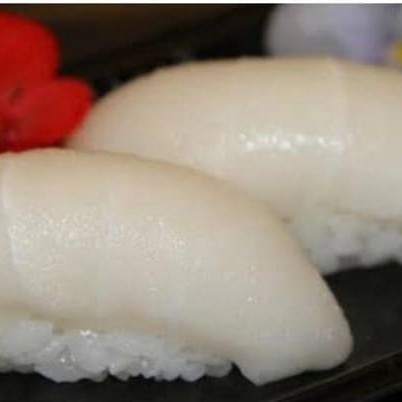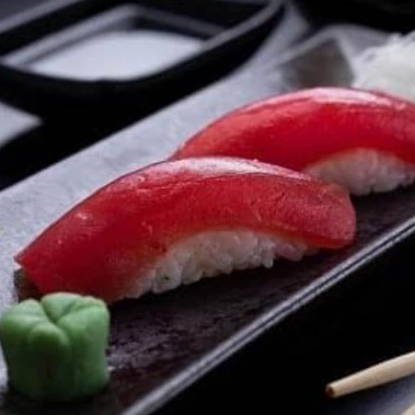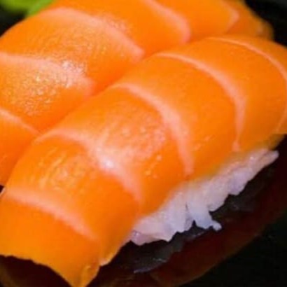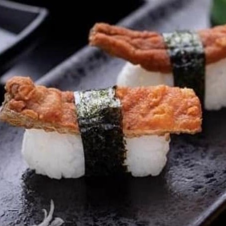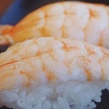 Dupla de bolinho de arroz com fatia de peixe ou crustáceo por cima.
