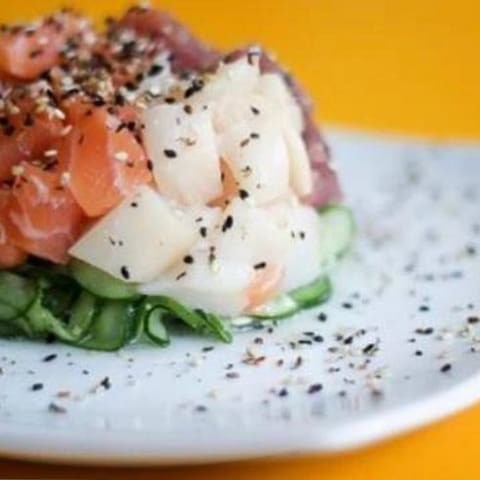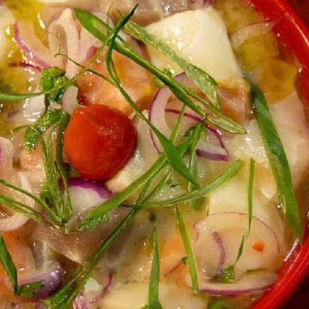 Salmão, polvo, atum e agulhão marinado em limão e azeite, com cebola roxa, pimenta biquinho, dedo de moça, tagarashi e cebolinha.
