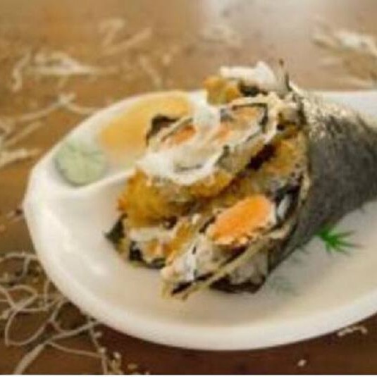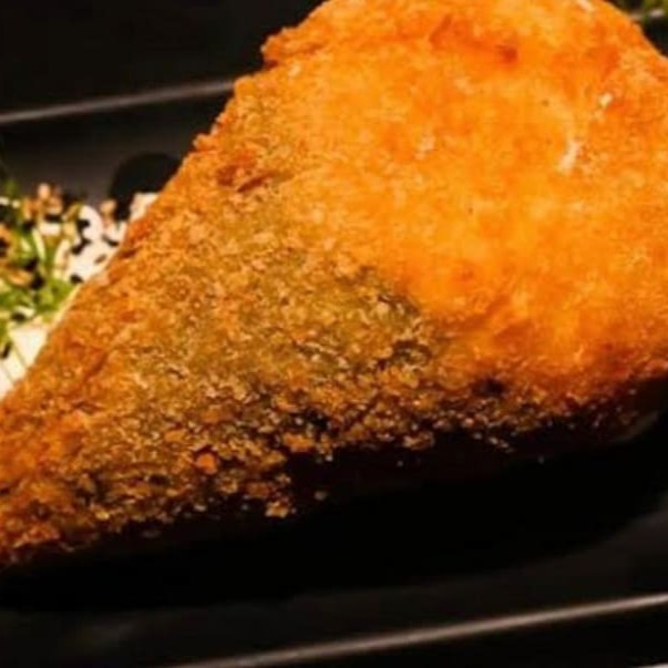 Enrolado de arroz e alga, empanado por fora, cream cheese em forma de cone.