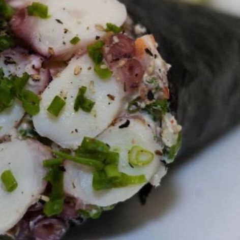 Salmão, atum, agulhão, kani e polvo. Enrolado de arroz, cream cheesse, alga em forma de cone com cebolinha e gergelim.