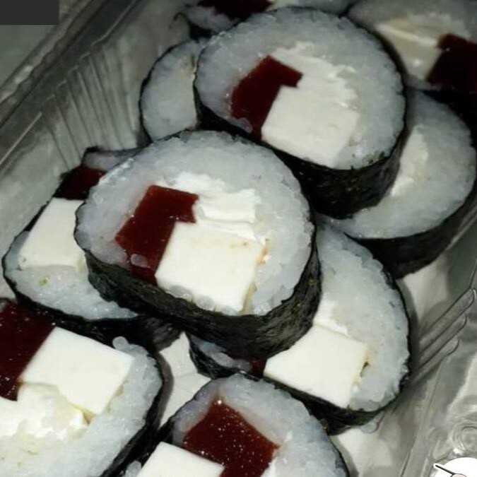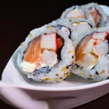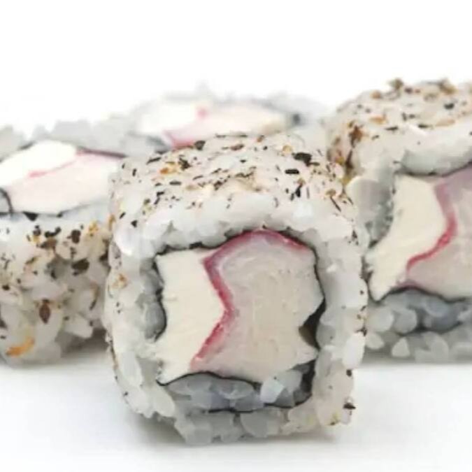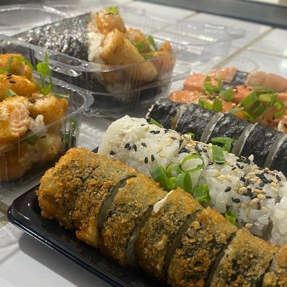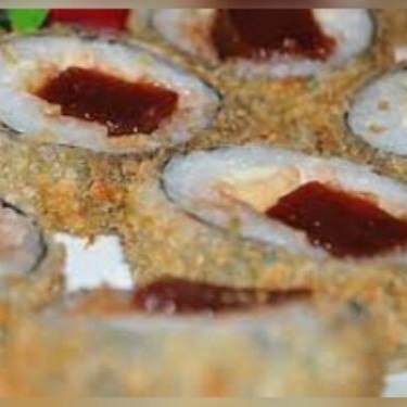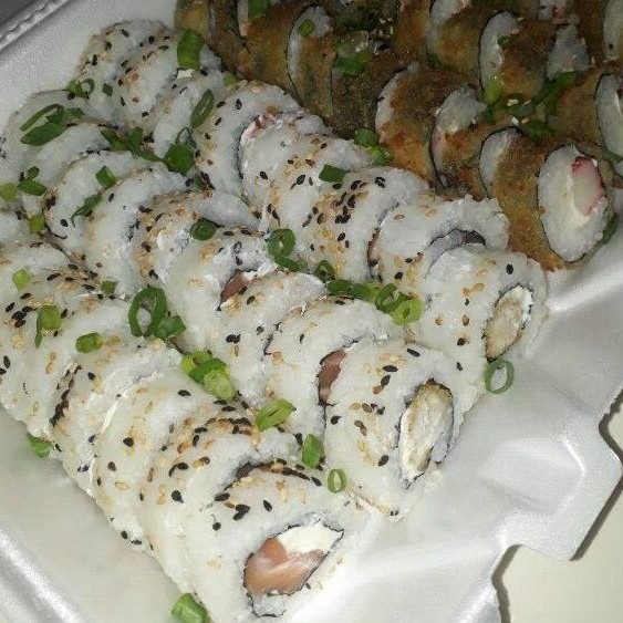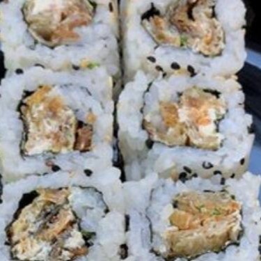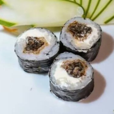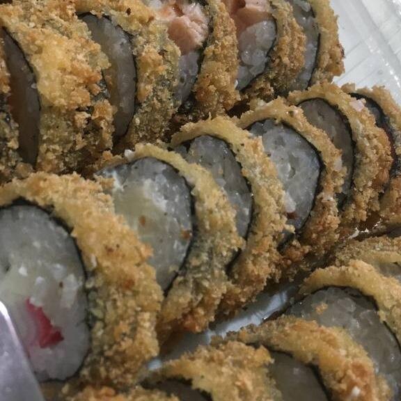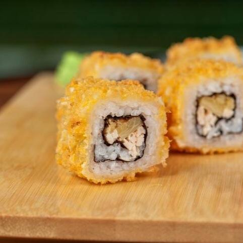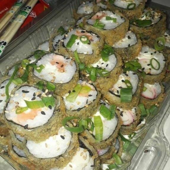 Enrolado de arroz japonês temperado, creme cheese, envolvido no nori, empanado e frito. Cebolinha e gergelim.