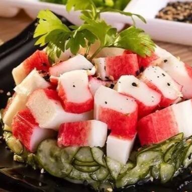 Cubos De Kani. Acompanhados de pepino agridoce, gergelim, e azeitona.