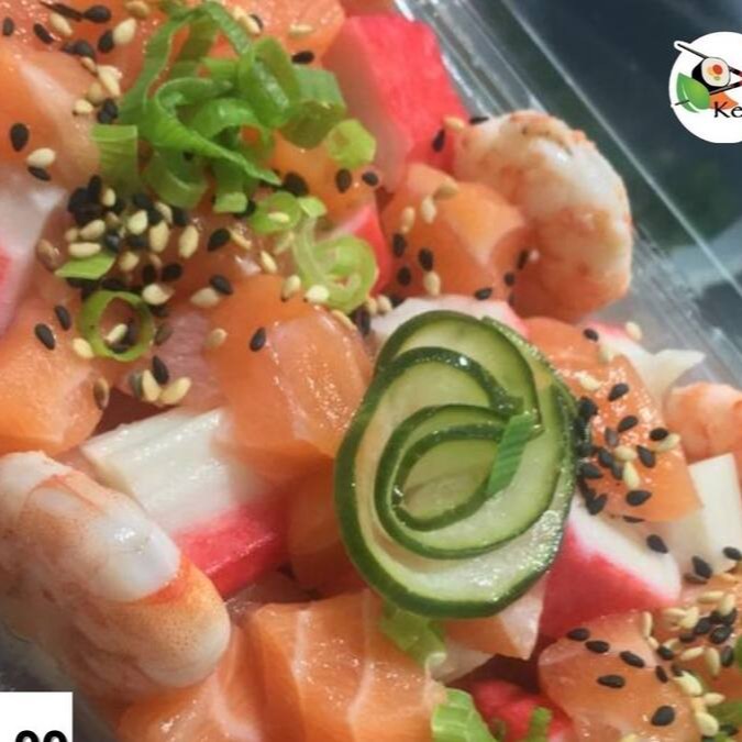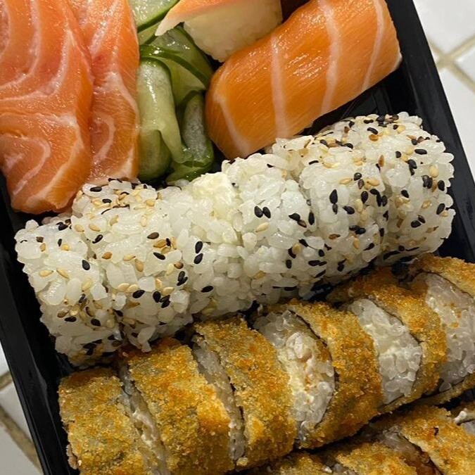Mix de cubos de salmão, peixe branco empanado, kani e camarões. Acompanhados de pepino agridoce e gergelim.