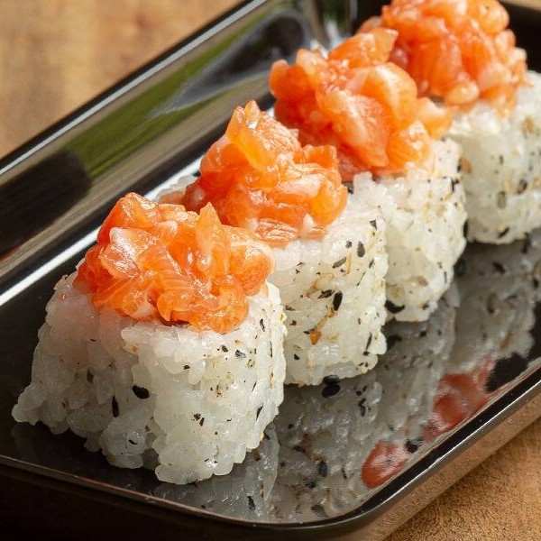 Lâmina de Salmão, arroz japonês temperado e cream cheease. Maçaricado ou natural, cebolinha e gergelim.
