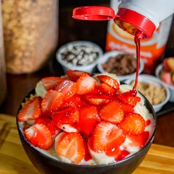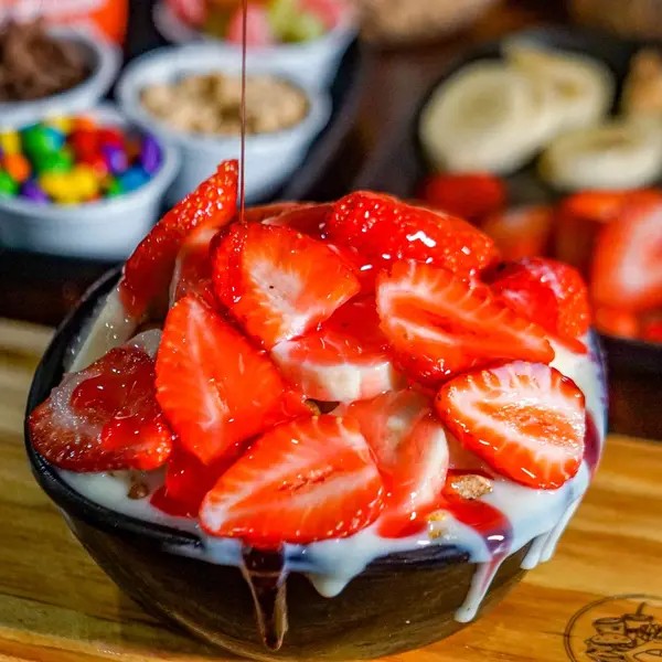Morango, Banana, Granola, Amedoim, Leite em Pó e Leite Condensado + 1 Adicional Gratuito.