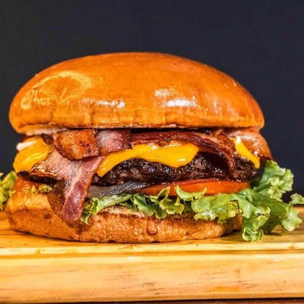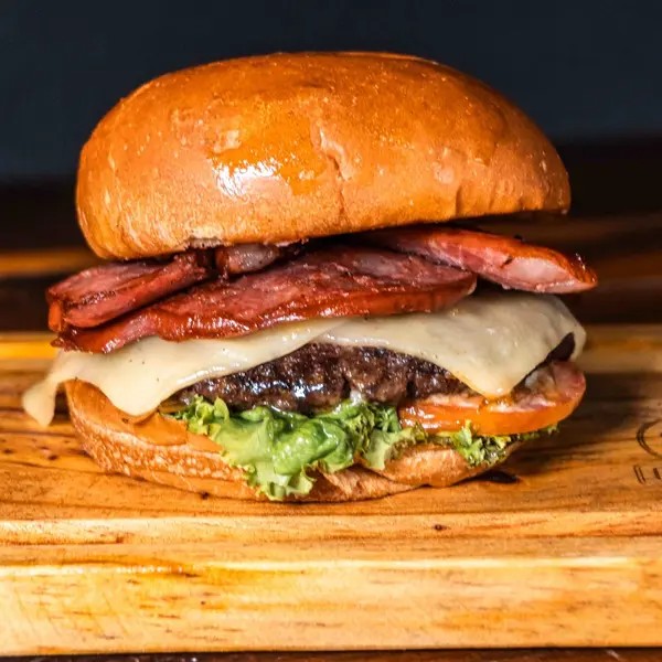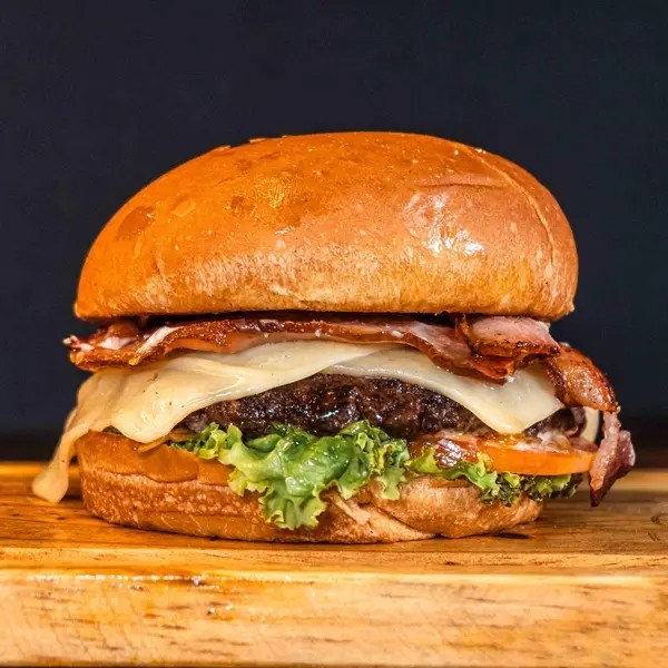 Pão Brioche, Blend De Casa 140g, Queijo Cheddar Derretido, Bacon fatiado,Salada E Maionese Defumada