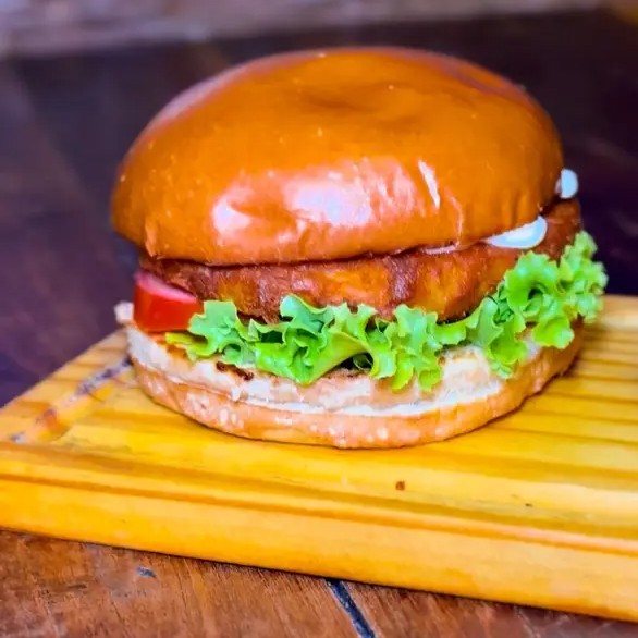 Pão Brioche, Blend De Frango empanado, cream cheese derretido e Salada