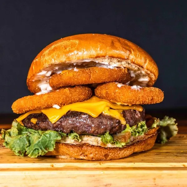 Pão Brioche, Blend De Casa 140g, Queijo Cheddar Derretido, Anéis de cebola empanada, Salada E Maionese Defumada