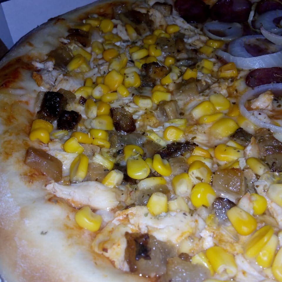 Molho, mussarela, frango, bacon ,milho , azeitonas e oregano.