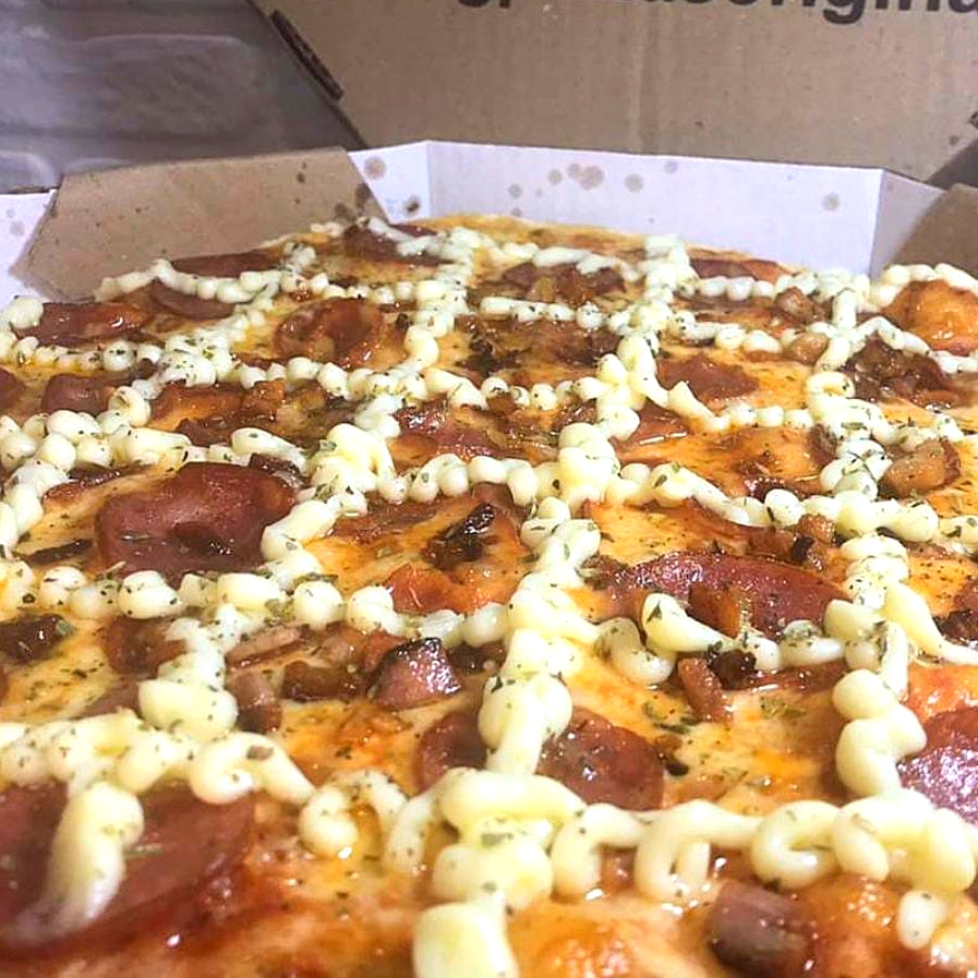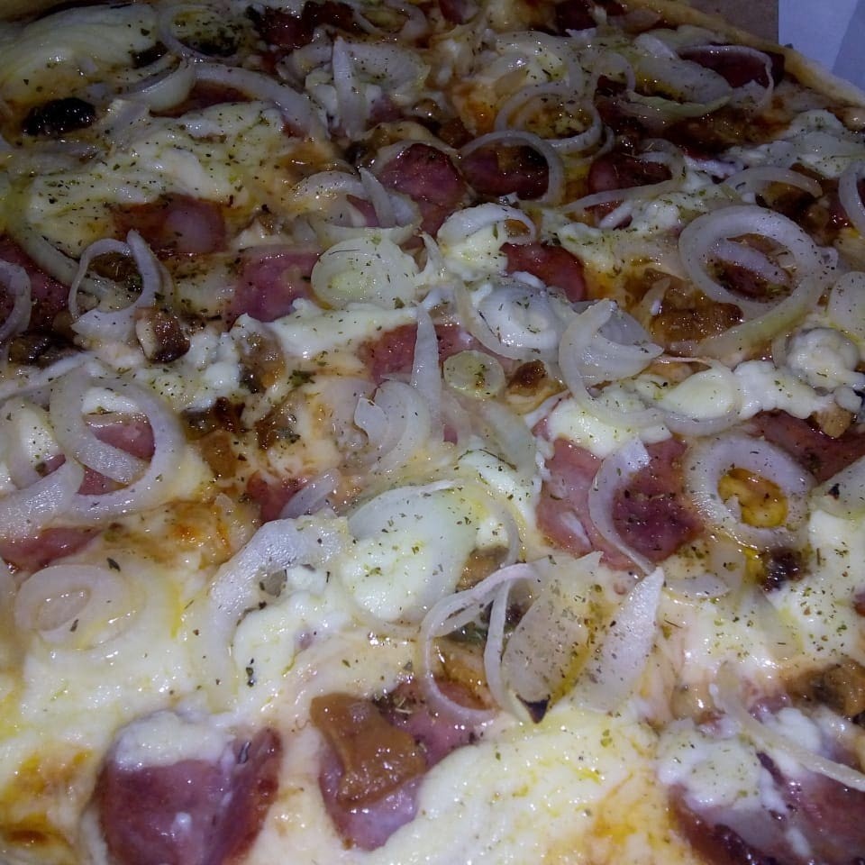Molho,mussarela, presunto, bacon, catupiry original, azeitonas e oregano.