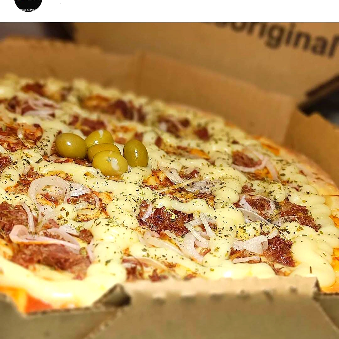 Molho,mussarela, charque desfiada, cebolas, catupiry original, azeitonas e oregano.