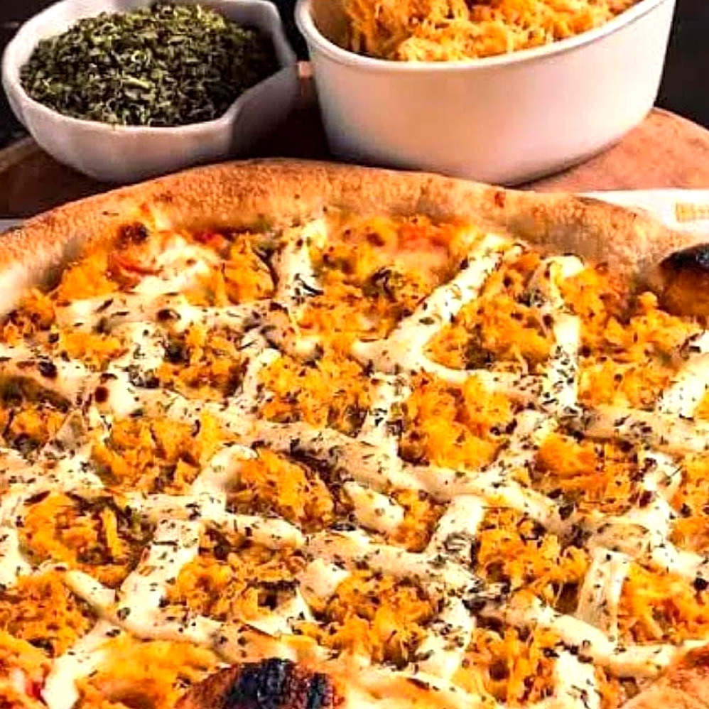 Massa, molho de tomate, mussarela,frango desfiado, cheddar e orégano.