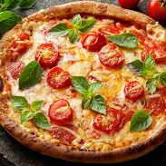 Massa,molho de tomate, mussarela, tomate, manjericão e orégano.