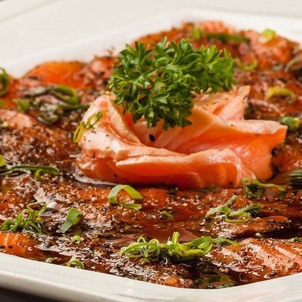 10 laminas de salmão regados com azeite, shoyu, um toque de limão e especiarias.