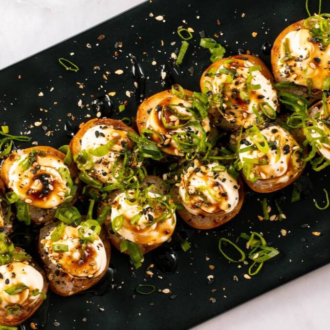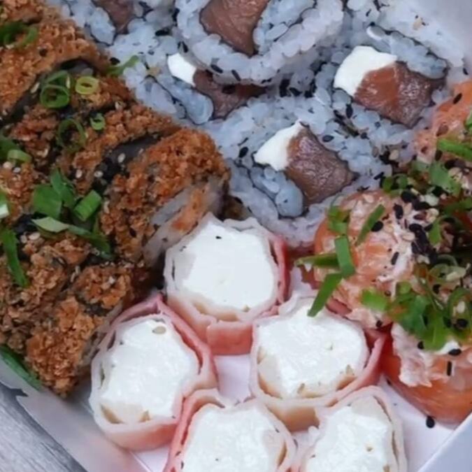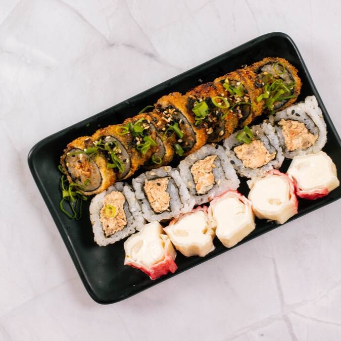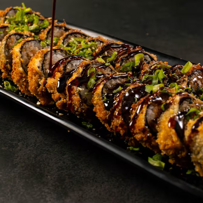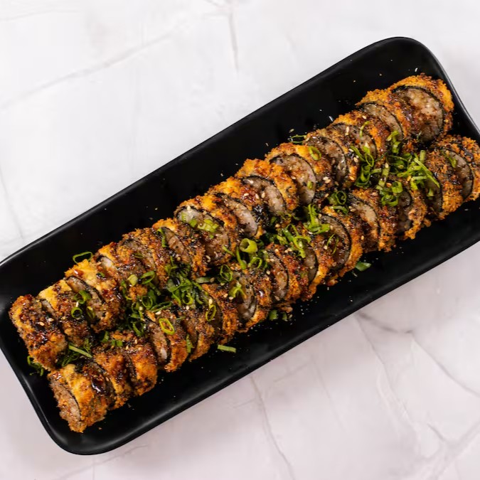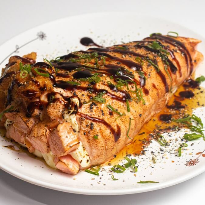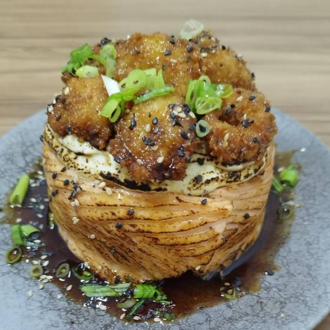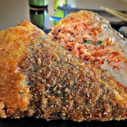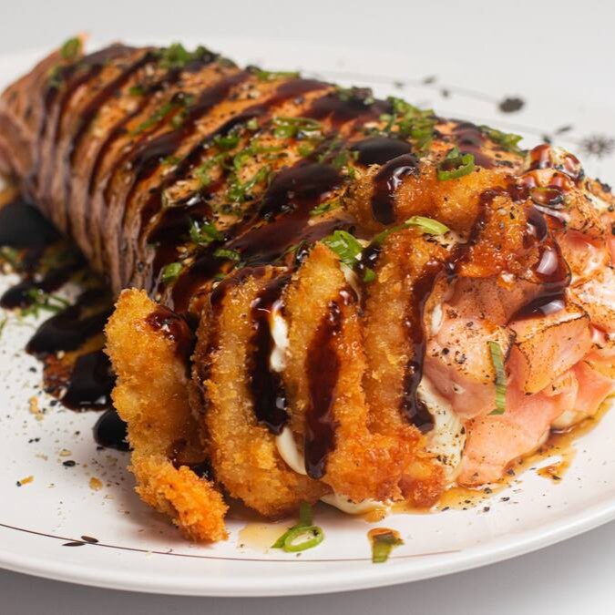 Rolls feitos com nori (alga japonesa), coberta com arroz e recheada com patê a base de salmão grelhado e cream cheese, empanados com farinha panko, finalizados com teriaki artesanal, gergelim e cebolinho.