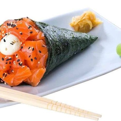 Temaki envolto no salmão maçaricado, recheado com camarão crocante, salmão, cream cheesse e arroz. Teriaki, molho Orange, gergelim e cebolinho decorando por cima.