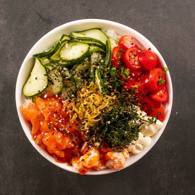 A base é arroz de sushi; Primeiro você escolhe as proteínas, segundo os molhos e por ultimo, nossas deliciosas coberturas.