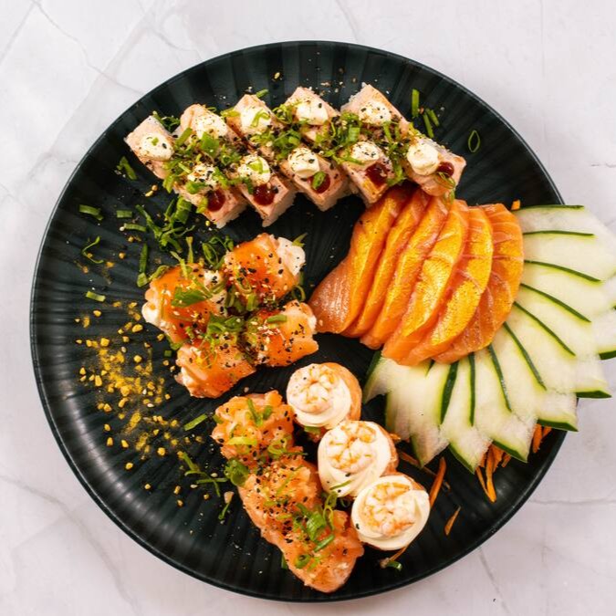 5 nigiri salmão + 5 uramaki salmão Grill +5 uramaki camarão +5 Jow jow + 5 ebi jow.
