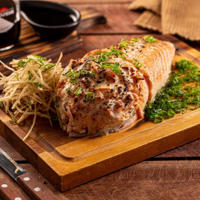 6 deliciosas lâminas de Salmão Maçaricado, generosamente recheado com Camarão empanado e Cream Cheese Original.