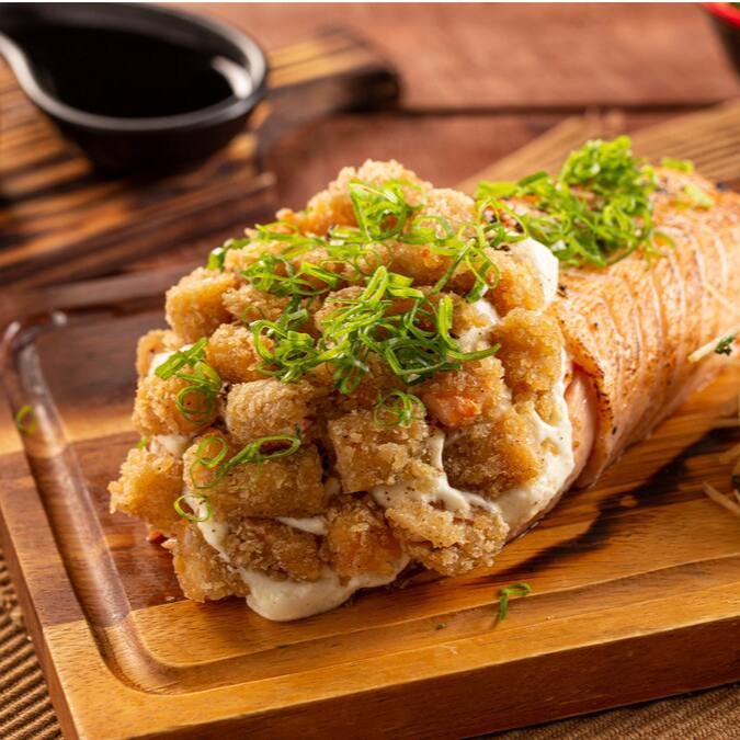 Preparado com um delicioso recheio de Salmão suculento, Cream Cheese origina, Arroz Japonês e finalizado com Farinha Japonesa de forma empanada, o deixando super crocante.