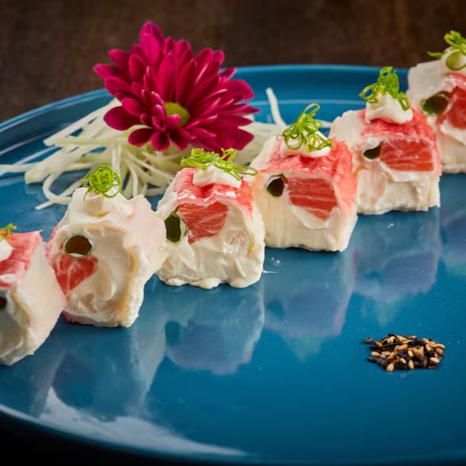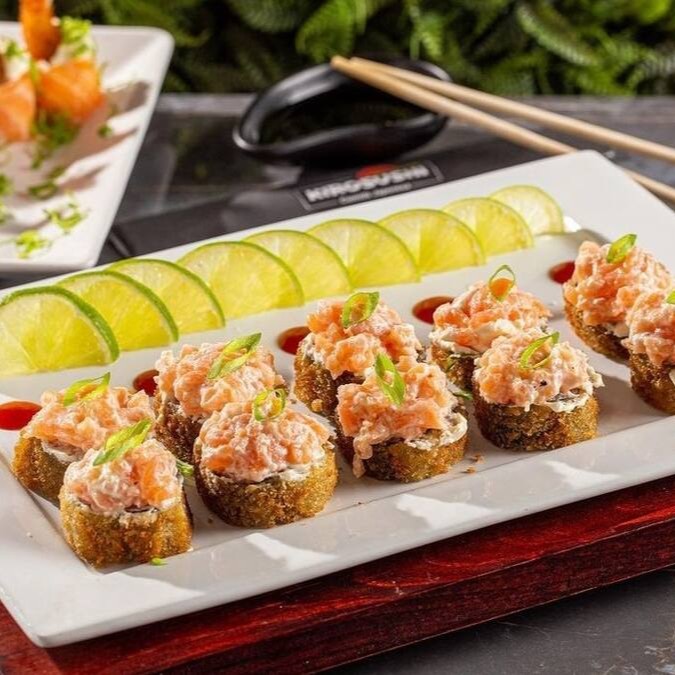 Sushi deliciosamente preparado com Salmão cuidadosamente selecionado, Cream Cheese Original, empanado, frito e finalizado com uma cobertura de Pasta de Salmão.