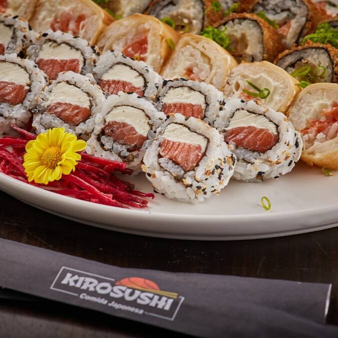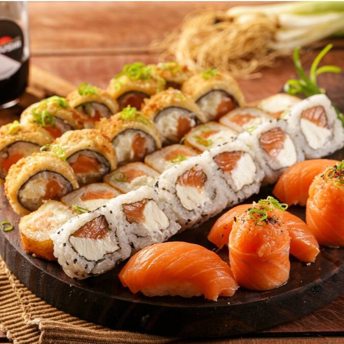 Preparado com um recheio generoso de Salmão, Cream Cheese, Arroz Japonês, envolvido com Nori e finalizado com Cebolinha.