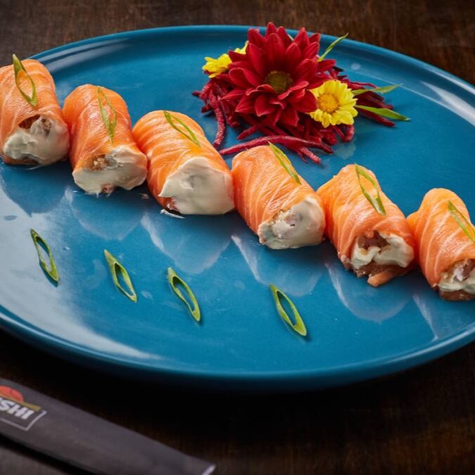 Preparado com uma deliciosa Pasta de Salmão, Cream Cheese Original e Arroz Japonês, finalizado e envolvido em uma massa de Rolinho Primavera.