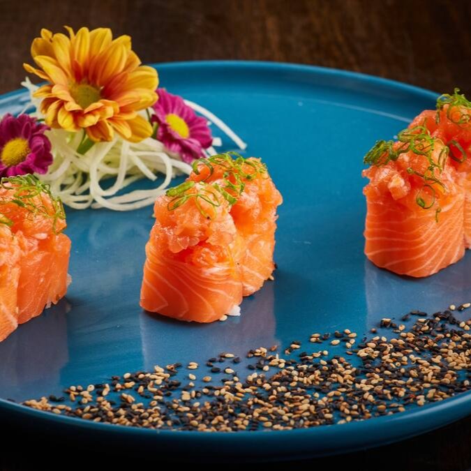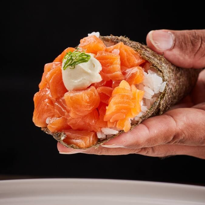 Deliciosamente preparado com de Arroz Japonês, uma camada generosa de de Pasta de Salmão, Cream Cheese Original e extra cremoso, finalizado com uma manta de filé de Salmão Maçaricado.