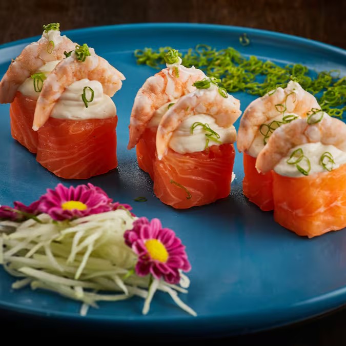 Deliciosamente preparado com Arroz Japonês, recheado generosamente com Camarão Cozido, Cream Cheese Original, coberto com Camarão Empanado e finalizado com uma manta de Filé Salmão maçaricasdo.