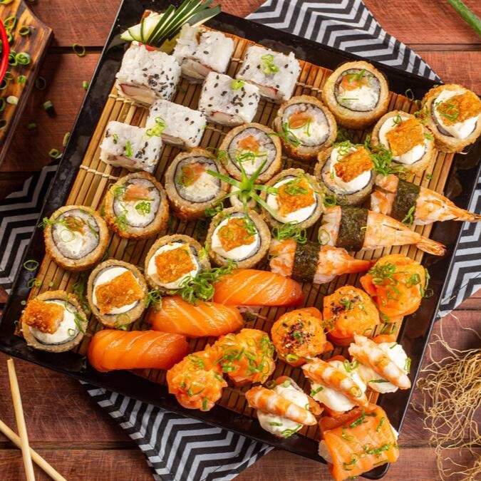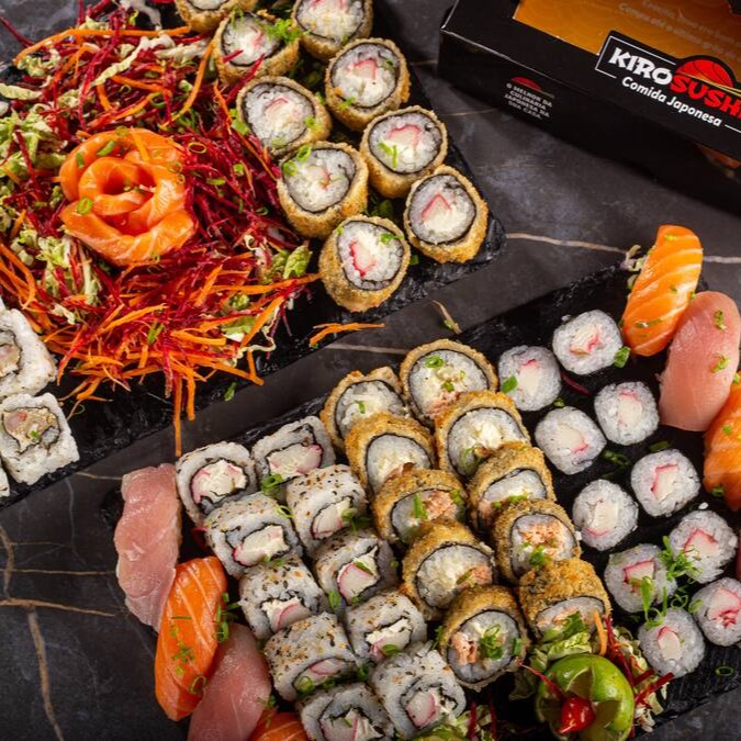 Um Combo delicioso composto por 20 Cariocas de Salmão, 10 Uramakis de Salmão, 10 Uramaki de Kani, 10 Hossomaki de Kani, 5 Niguiri de Salmão, 5 Niguiri de Atum, 5 Laminas de Sashimi de Salmão e 5 Eby Joy.