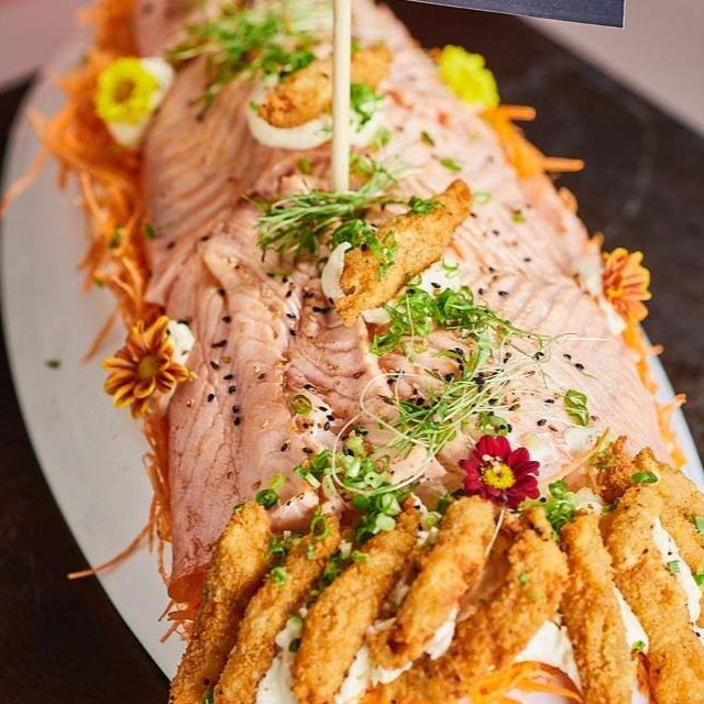 São 2 Kg de muito sabor : Recheado com arroz, Cream cheese e muito camarão crocante coberto com uma manta de salmão..
