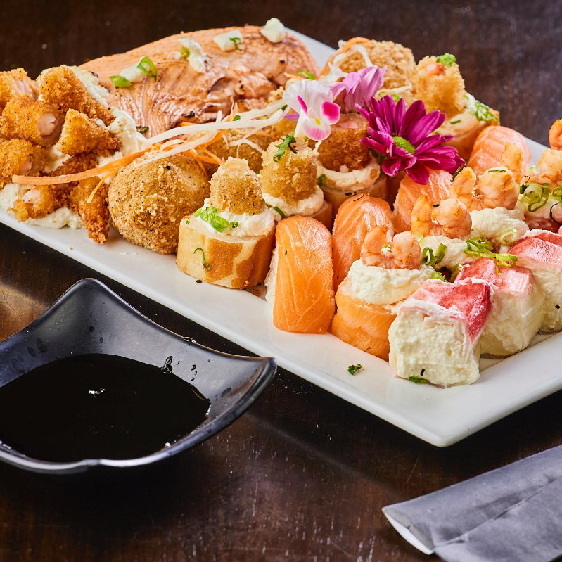 Um delicioso Combo com 1 Supremo com camarão de 300g + 5 Eby joy Maçaricado + 5 Kani Keijo + Niguiri de Salmão + 10 Carioca de Camarão especial