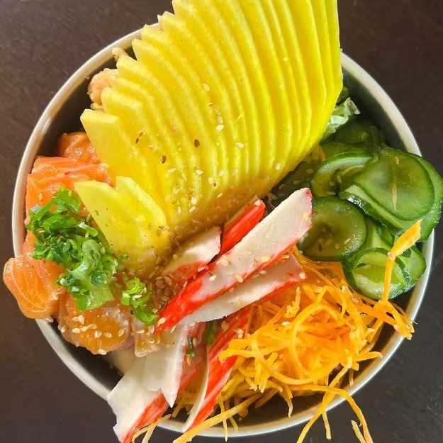 É composto por uma base de arroz de sushi, suavemente temperado. A doçura exótica da manga se entrelaça perfeitamente com o refrescante pepino japonês. Acrescentamos kani para um toque extra de sabor do mar, complementado por alga e gergelim para um sabor autêntico oriental. A cebolinha adiciona uma pitada de frescor e o molho tarê confere um sabor agridoce irresistível. Para finalizar, o prato é coroado com generosas porções de salmão, e camarão, garantindo uma explosão de sabor a cada garfada. Uma verdadeira viagem gastronômica ao paraíso tropical do Havaí!