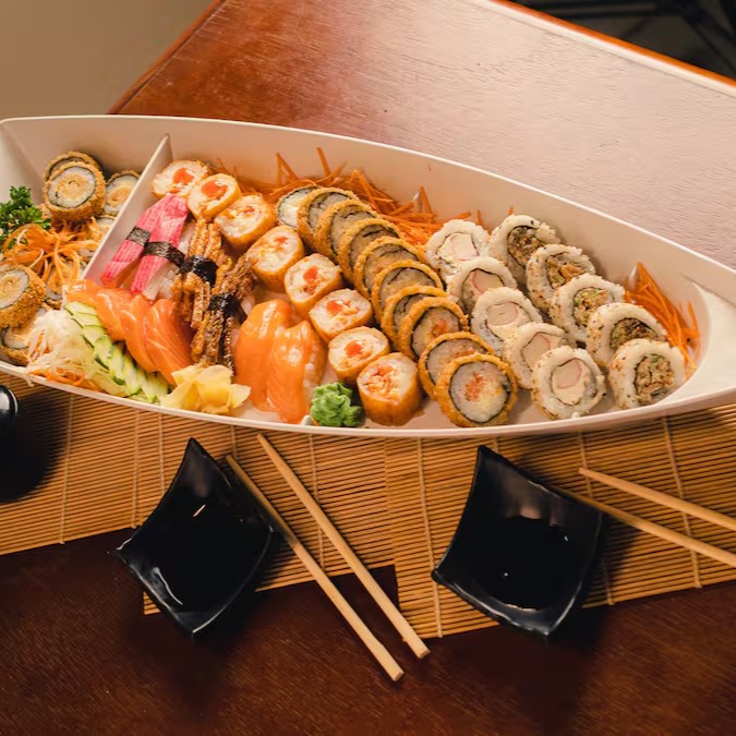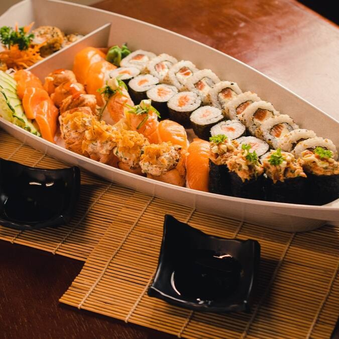 Saborosa e satisfatória, a Tradicional - 50 peças é uma barca repleta de delícias do mar. Contém dez peças de 'Carioca Camarão', envolventes e suculentas, dez peças do aromático 'Harumaki Salmão', e dez peças do apimentado 'Hot'. Complementando esta variedade, temos cinco unidades do 'Uramaki Kani', um deleite para o paladar, cinco peças do sofisticado 'Uramaki Salmão' e cinco peças do fresquíssimo 'Nigiri Salmão'. Finalizando a experiência, você desfrutará de cinco peças do nosso tenro 'Sashimi Salmão'. Uma escolha perfeita para os amantes da culinária japonesa!