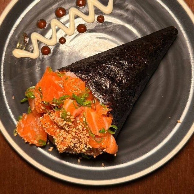 Cada mordida desse prato deslumbrante revela o sabor fresco e suculento do salmão, cuidadosamente selecionado e preparado para proporcionar a você uma experiência culinária inigualável. A textura macia do peixe se casa perfeitamente com o arroz e a alga, que envolvem o temaki, elevando ainda mais a sensação de satisfação.