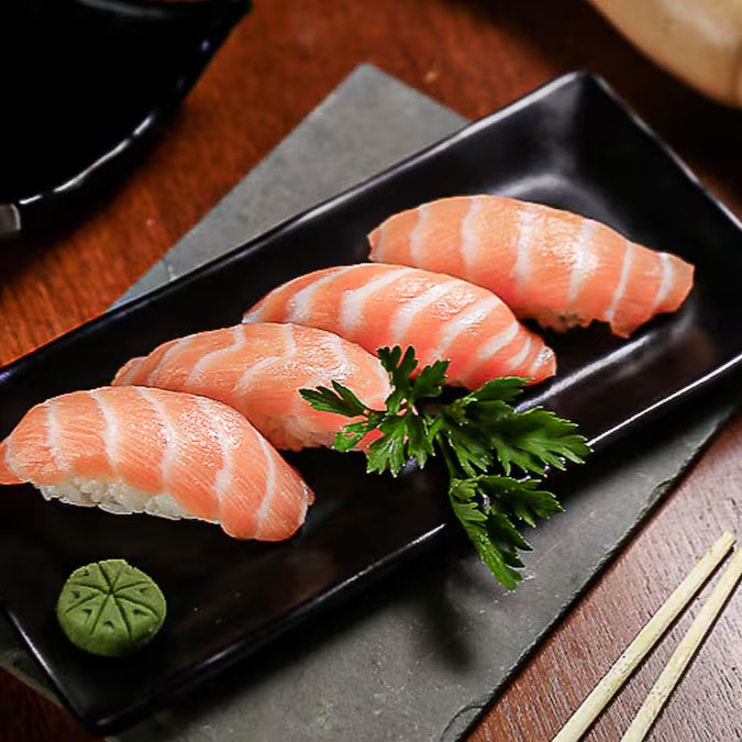 Delicie-se com quatro refinadas lâminas de salmão, meticulosamente cortadas, realçando a suculência e o sabor inconfundível deste nobre peixe. O frescor intenso e a textura impecável das fatias de salmão proporcionam uma experiência culinária extraordinária. Um prato simples, mas repleto de sofisticação e sabor, ideal para os verdadeiros apreciadores da culinária japonesa.