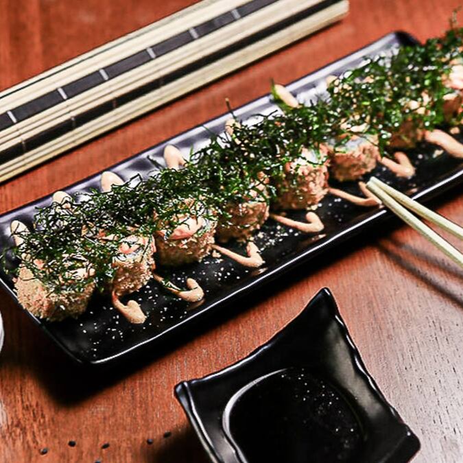 Lâminas de salmão maçaricado com recheio de arroz, salmão crocante e cream cheese.