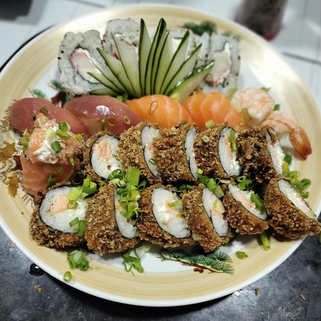 10 CARIOCA DE SALMÃO, 10 URAMAKI DE KANI, 10 URAMAKI DE CAMARÃO EMPANADO, 10 URAMAKI DE PEIXE FRITO E 20 NIGIRI VARIADO