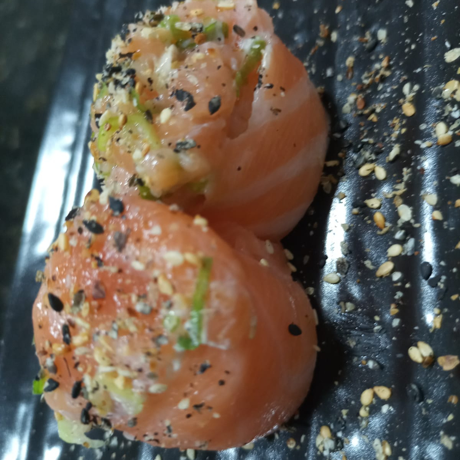 6 JOY JOY DE SALMÃO (CREAM CHESS, CEBOLINHA,MANJERICÃO E AZEITE) E 5 SASHIMI DE SALMÃO