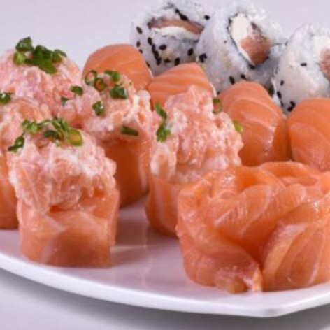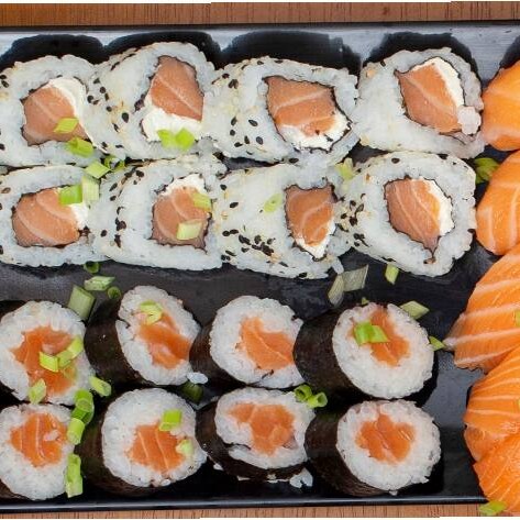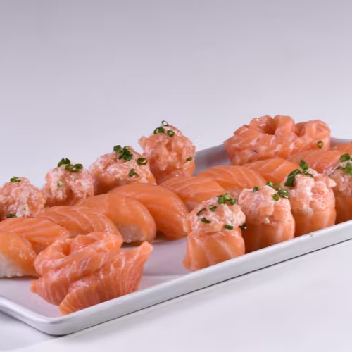 5 sashimi (lâminas de salmão), 5 joy joy natural ou maçaricado (bolinho de arroz envolto por lâmina de salmão coberto por patê de salmão), 10 niguiri natural ou maçaricado (bolinho de arroz coberto de lâmina de salmão), 10 uramaki salmão e cream cheese, 10 hossomaki (arroz envolto de nori, recheio de salmão e cream cheese) e 10 carioca salmão com cream cheese. ( se não fizer observação, vai natural)