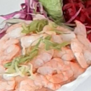 Camarão, cenoura, repolho roxo, pepino desidratado e gergelim