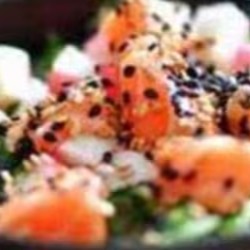 Salmão frito, manga, , repolho roxo, pepino desidratado e gergelim