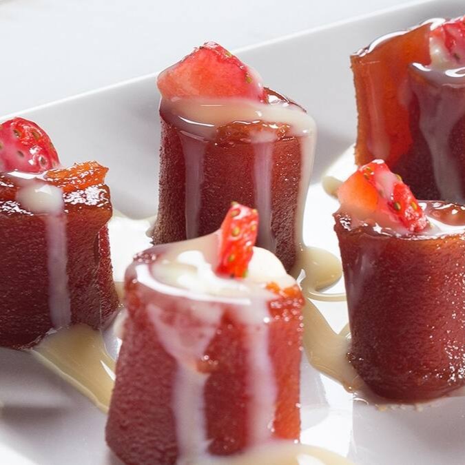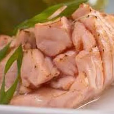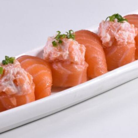 Lâmina de salmão maçaricado, camarão, salmão e kani crocante, cream cheese, cebolinha, gergelim e molho teriyaki. Acompanha Romeu e Julieta especial Dia dos Namorados.