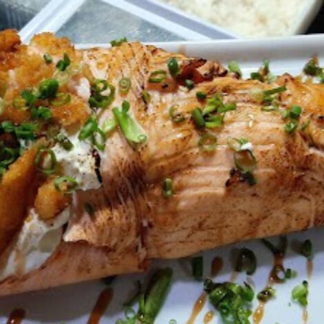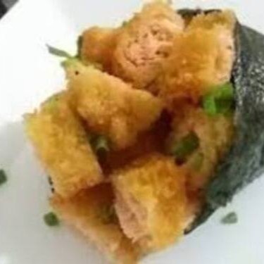 Lamina de salmão massaricado, camarão, salmão e kani crocante, cream cheese, cebolinha, e molho teryaki.