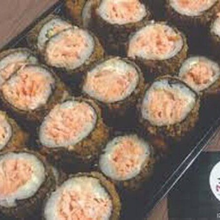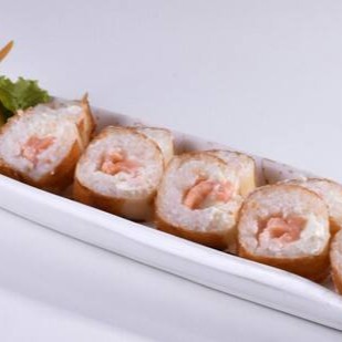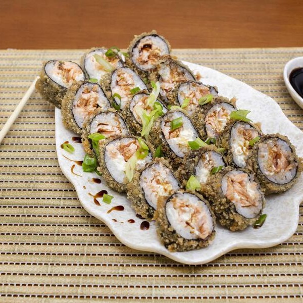 Arroz enrolado com massa de rolinho primavera e com recheio de cream cheese 10 salmão, 10 kani e 10 camarão.